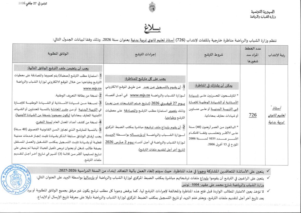 تفتح وزارة الشباب والرياضة، مناظرة خارجية يوم 27 مارس 2026 والأيام الموالية لانتداب 726 خطة ضمن سلك أساتذة التعليم الثانوي اختصاص تربية بدنية بعنوان سنة 2026، وفق ما جاء في قرار أصدره وزير الشباب والرياضة ونشر بالرائد الرسمي للجمهورية التونسية.